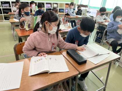 国語では説明文「おにごっこ」を学習しています。文に出てくるいろいろなおにごっこの遊び方やよいところを読み取って、自分の知っていることとつなげて感想を伝え合っています。