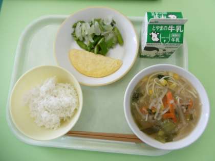 本日の献立は、ごはん、こまったさんのオムレツ、魔女のフレンチサラダ、行列ができるこまったさんのラーメン、牛乳です。