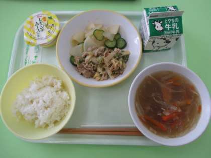 本日の献立は、ごはん、牛乳、ピーマンマンの炒め物、かぶの中華あえ、春雨スープ、レモンムースです。