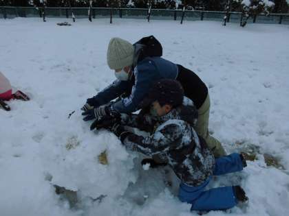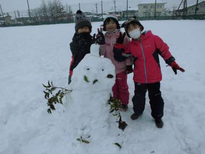 チャレンジ山を滑り降りたり、みんなで協力して大きな雪玉を作り、雪だるまや雪山を作ったりしました。「疲れた!でも、すごく楽しかった!」と、大満足の子供たちでした。