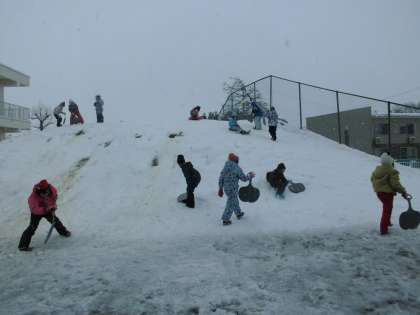 雪が降ったりやんだりの天気でしたが、子供たちが楽しみにしていた雪遊びをしました。