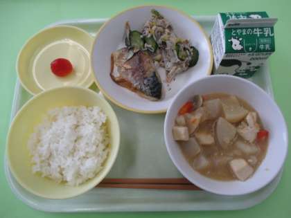 学校給食週間最終日、本日の献立は、ごはん、牛乳、さばの塩焼き、えのきの梅肉あえ、のっぺい、いちごです。