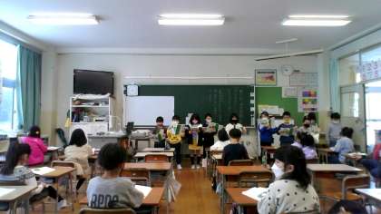 国語科で学習した「たぬきの糸車」の音読発表会の様子です。