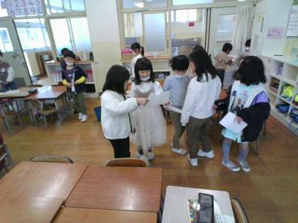 今日は節分だったので、子供たちは、自分がやっつけたいオニをプリントに書いて、友達に紹介しました。