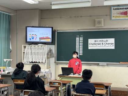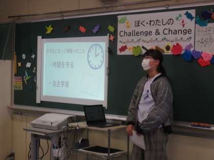 5年生は、4月から学年目標「Challenge&Change」を大切にしながら、過ごしてきました。今日は、一人一人が自分自身を振り返って見付けた「自分の頑張りや挑戦」「自分の変化や成長」を発表しました。