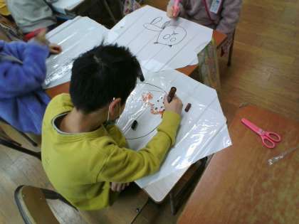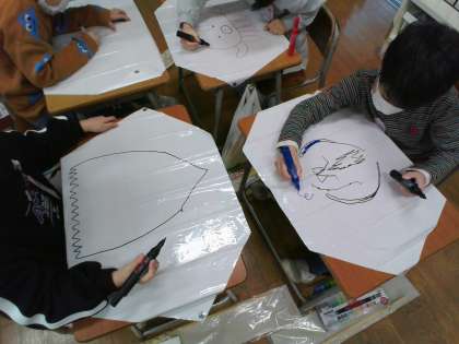生活科で昔の遊びを楽しんでいる1年生。この日は凧揚げのために、凧に絵を書きました。