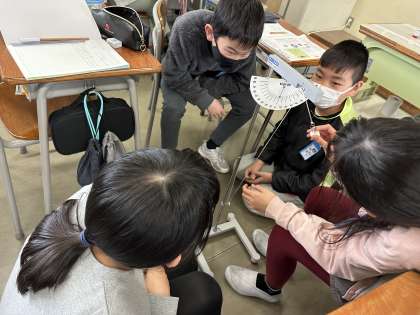 理科の時間では、ふりこを使ってテンポの異なる歌に合うように、おもりの数やふりこの長さなどを調節していました。「おもりを増やすとおそくなった」「ふりこを短くしたら速くなる」と気付き、友達と話し合いながら、実験方法を考えて取り組んでいました。