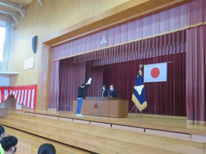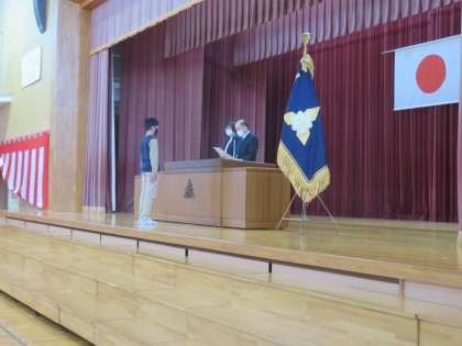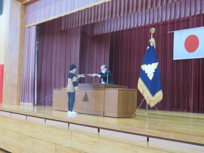 同窓会入会式の後に、修了式が行われ、各クラスの代表児童が小学校生活最後の修了証を受け取りました。教室では一人一人に担任から修了証が手渡され、子供たちは達成感に満ちた表情でした。