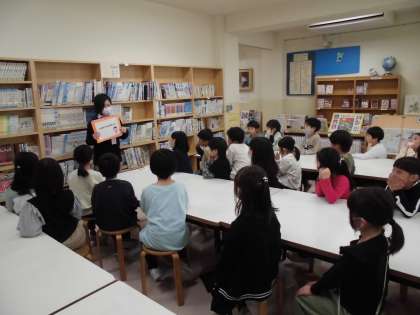 図書室の中川先生が子供たちに、図書室の使い方についてお話をされた後、絵本の読み聞かせをしてくださいました。