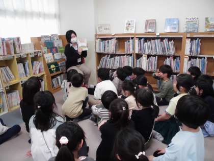 図書室の中川先生が子供たちに、図書室の使い方についてお話をされた後、絵本の読み聞かせをしてくださいました。
