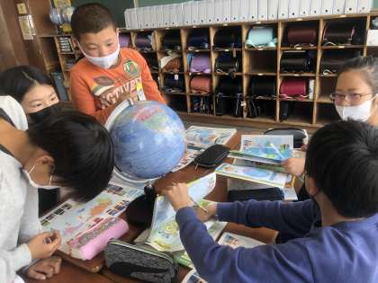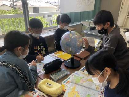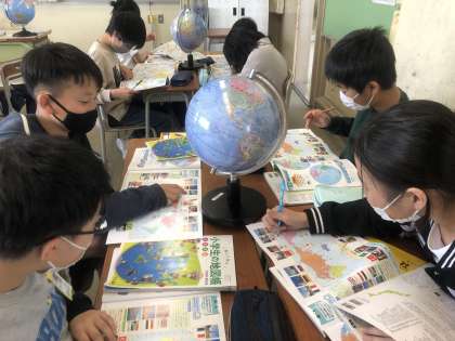 社会科では世界の国土について学習しています。地球儀を使いながら、大陸や海の名前を調べたり、日本と同じ緯度や経度の国を調べたりしています。子供たちは興味津々で世界について学んでいます。