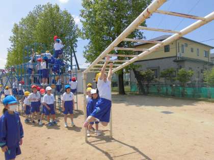 運動会に向けて色団が決まりました。準備体操をして、団ごとに並ぶ練習をした後、遊具で遊びました。順番を守って、仲良く体を動かしました。