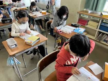 3年生は、国語で国語辞典の使い方を学習しています。「この言葉の意味、分かるかな。