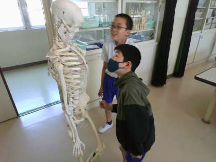 今日は理科室の人体模型を使って、実際に骨のつくりを調べました。