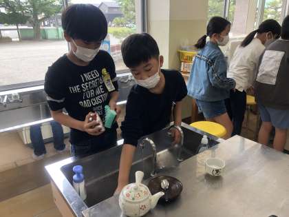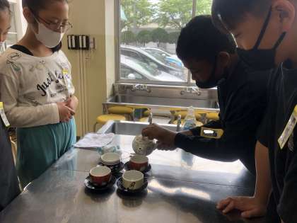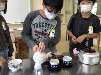 家庭科でお茶を淹れる学習をしています。初めて自分たちで淹れるお茶に「苦い」という声もありましたが、美味しそうに飲む子供たちの姿がありました。「おうちの人にも淹れたいな」と言う声も聞かれました。ぜひ、ご家庭でも実践してほしいです。