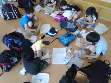 今日は宿泊学習の持ち物の荷物点検をしました。名前は書いてあるか、足りないものはないかなどを班ごとに確認しました。リーダーを中心に静かに素早く並ぶ子供たち。とても立派でした。