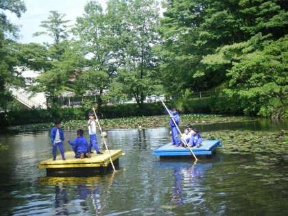 1日目の午後は「自然遊び」です。いかだに乗ったり池ジャングルに挑戦したりして思い切り遊びました。