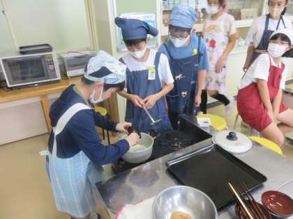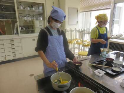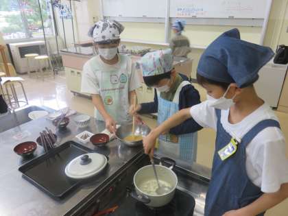 家庭科の学習で、日本の伝統食である味噌汁作りに挑戦しました。友達と協力しながら、煮干しからていねいにだしをとった味噌汁は、味も香りも格別だったようです。
