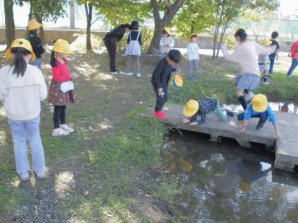 生活科の学習では、みんなでビオトープへ行き、秋を探しました。色付いた葉っぱやかわいいどんぐりを拾い集めたり、虫を探したり、思い思いに楽しみました。