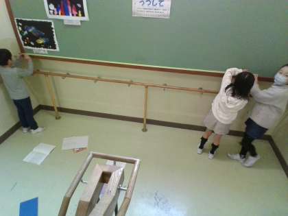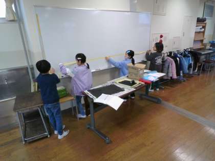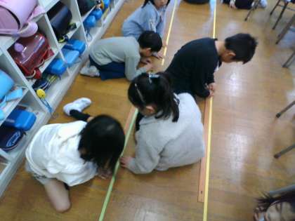 今日は紙テープに10cm、1mごとに印を付けて、班ごとに物差しを作りました。
