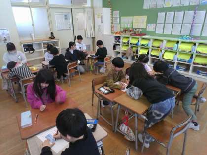 算数科では、「どちらがひろい」の学習に取り組み、広さの比べ方を考えました。はしをそろえて比べたり、タイルの数を数えたりするなど、比べるものによって分かりやすい比べ方があることに気づきました。