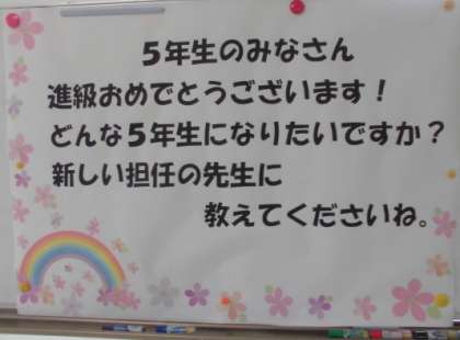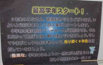 始業式の朝、5・6年生の廊下の前には、上下のような掲示がありました。高学年になり、わくわくドキドキの子供たちを迎える担任の思いが表れています。