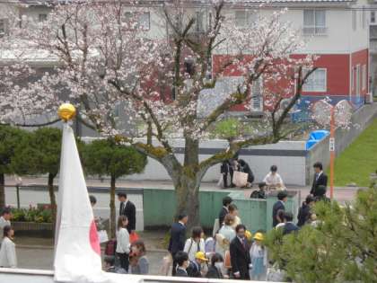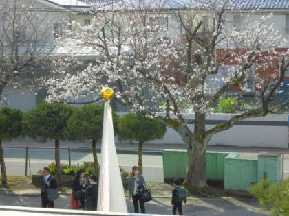 82名の新入生が入学してきました。おめでとうございます。※画像は、朝と帰宅時、校門の桜の下で、親子記念撮影をされる様子。