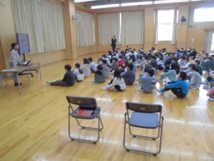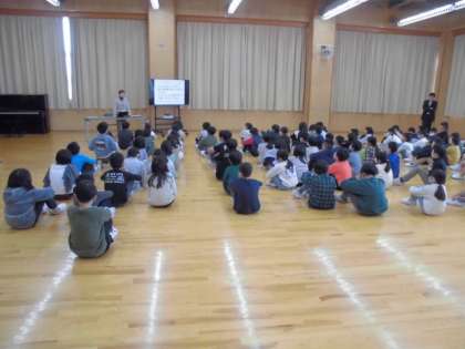 サブアリーナに集まって学年集会をする5年生。高学年としての約束や目標を話し合っています。