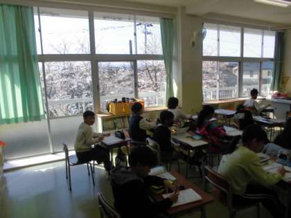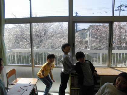 左下の画像は、学校で一番桜が横に見える教室で算数を学習する4年生。右下も真横に桜をのぞむ3年生、休み時間の様子です。