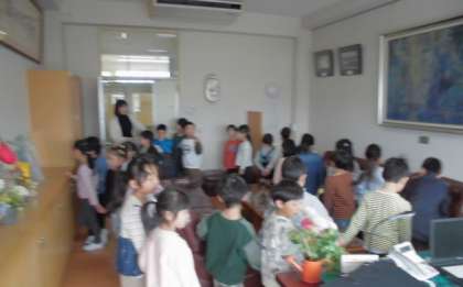 1年生が学校たんけんをしています。下の画像は校長室に入った様子。「どうして校長室には、大きないす(ソファー)があるの」学校のふしぎや気付きを見つけます。