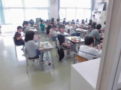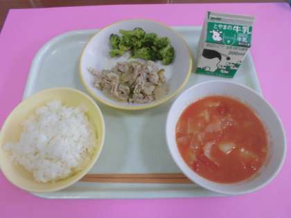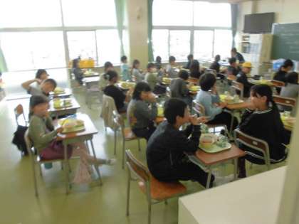 「ごはん、ポークソテー、白いんげん豆のトマト煮、ゆでブロッコリー」でした。画像はおししく食べる4年生の様子です。
