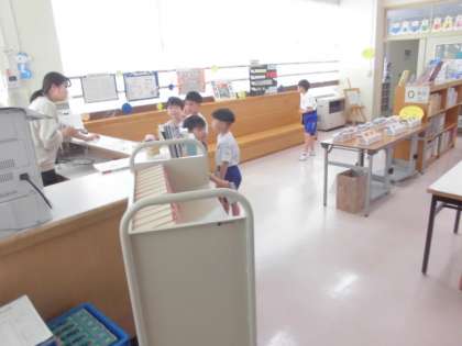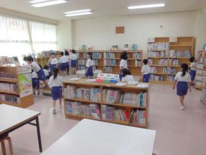 図書室で本を返したり借りたりして、読書をする1年生。「小学校の図書室には本がたくさんあるね」「どの本を読むか迷うよ」迷ってさがすところから勉強です。