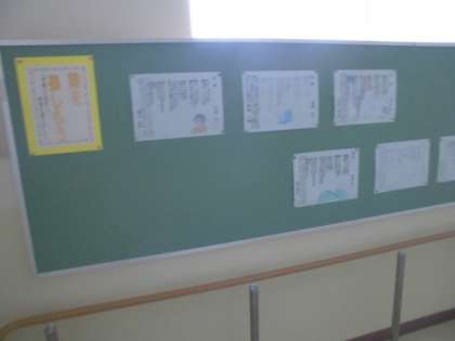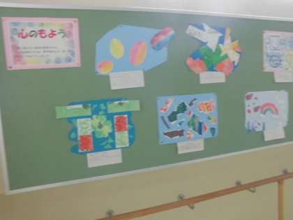 階段の踊り場には、各学年の図工や詩の作品が展示してあります。春らしい淡い色づかいや、気持ちを表した文章がみられます。学習参観でご覧ください。