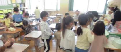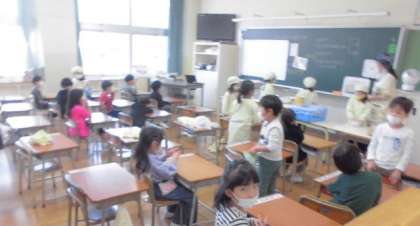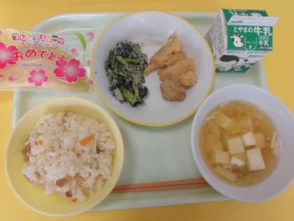 今日の献立は「ちらしずし、鶏肉の唐揚げ、よごし、すまし汁、お祝いデザート(いちごクレープ」でした。自分たち新入生をお祝いする給食を準備する1年生。上手になってきましたね。