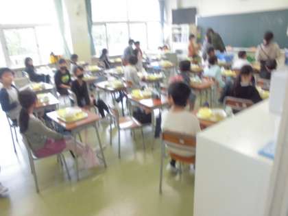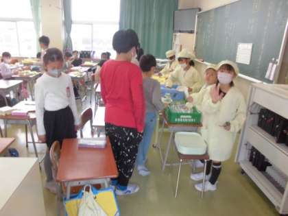 今日の献立は「ごはん、カレーライス、福神あえ、フルーツヨーグルト」でした。画像は、手際よく準備する4年生の様子です。