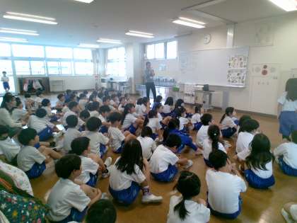 2年生で学年集会をしました。まずは、4月の振り返りとして、あいさつ・きくこと・1年生のお手本の3つについて、自分の姿を振り返り、今月の目当てを確認しました。来月の学年集会で自信をもって手を挙げられる子が増えるといいなと思います。その後は、玉入れのダンスを練習しました。子供たちは楽しそうに踊り、休み時間にも進んで練習している子もいました。