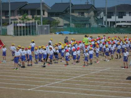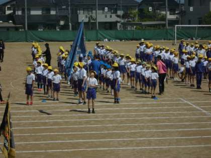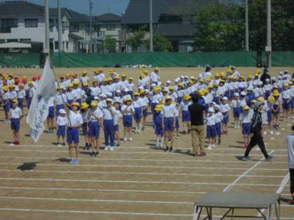運動会の入場練習で、赤・白・青・黄各団が整列した様子です。(10日の画像)