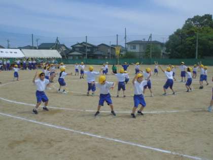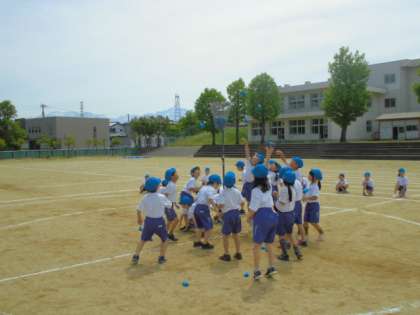 運動会予行3 「青空に向かって玉を投げる1・2年生」