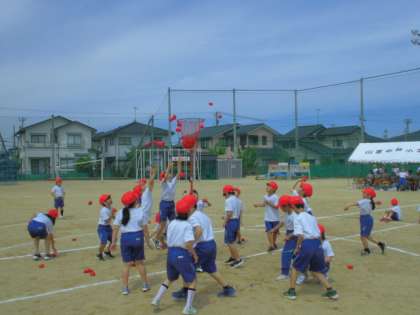 1・2年生の団体競技は玉入れ。初めにダンスをした後、一人2個の球を投げ入れます。