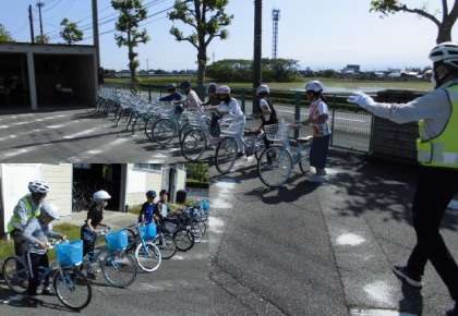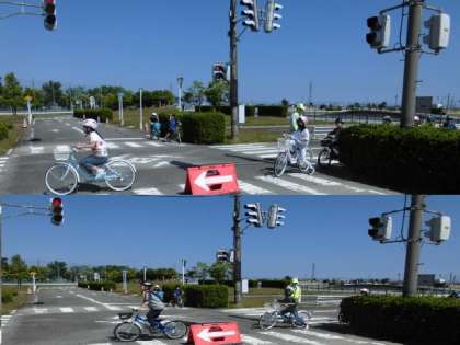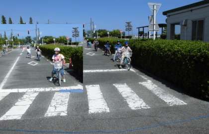 4年生がバスで県交通公園に行き、自転車教室をしました。交通指導員の方に正しい自転車乗車について教えていただき、信号や踏み切り、交差点がある模擬道路で運転して、筆記試験にも合格して全員、修了証をもらいました。今後も実際の道路で乗る場合、ヘルメットをかぶり、飛び出しをせず、交通安全に十分注意して乗車しましょうね。(画像は1組の様子)