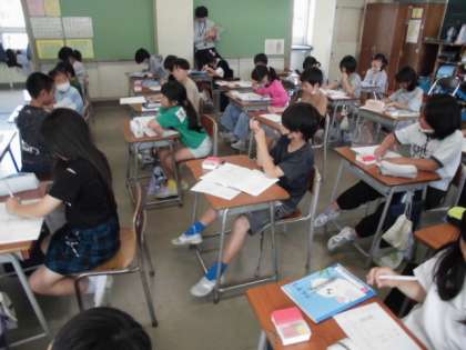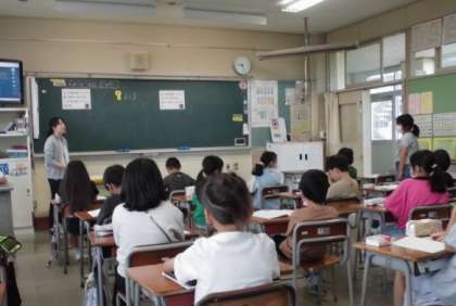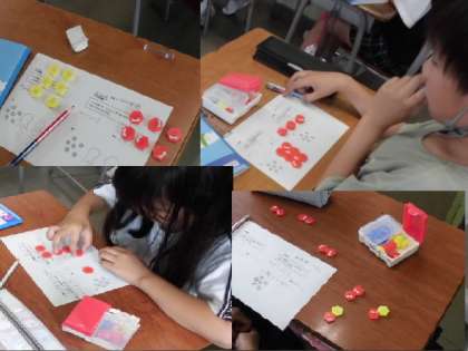 3年生が算数で、式はどちらも「6÷2」になる2つの問題の違いを考えました。「二人で分けると一人分が3個」「2こずつ分けると3人に分けられる」など、おはじきや図を使って考え、友達同士で説明しながら話し合っていました。