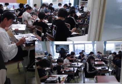 6年生が書写で「街角」という題字を練習しています。画数が多い字なので、太さやはね・はらいに注意して慎重に書くことで、だんだんと上達してきました。