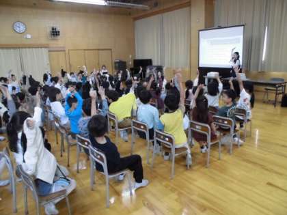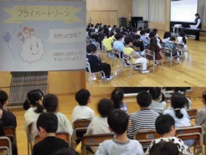 1年生が、富山県警察少年サポートセンター職員の方から「くもくん教室」をしていただきました。水着で隠れる部分の「プライベートゾーン」の大切さや、自分も他人の体も大切にし、嫌なことがあれば友達や大人の人に言うことを教えてもらいました。ぜひ、ご家庭でも話し合ってください。<参考>https://police.pref.toyama.jp/6123/anzen/jidou/kj00001346.html