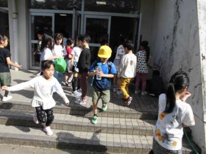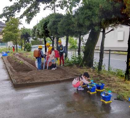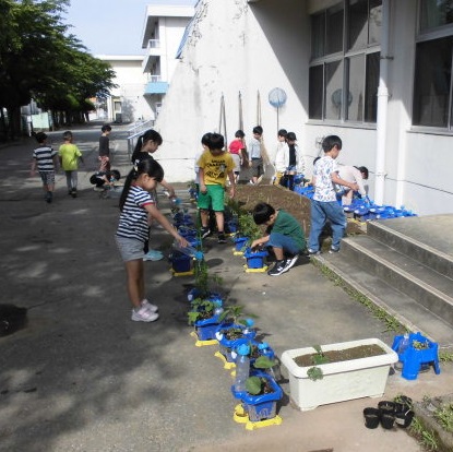 東児童玄関前では、毎朝、1〜3年生が花や野菜の水やりをしています。1年生も、大事そうにアサガオの芽に水をやっています。