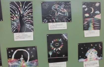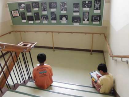 東階段に掲示してある図画工作の作品「消して書く」を鑑賞する5年生。学習参観においでの際にご覧ください。