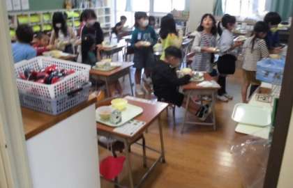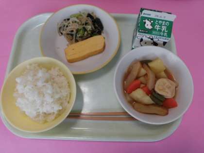 「ごはん、厚焼き卵、かんとうだき、小松菜のごまあえ」でした。