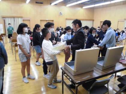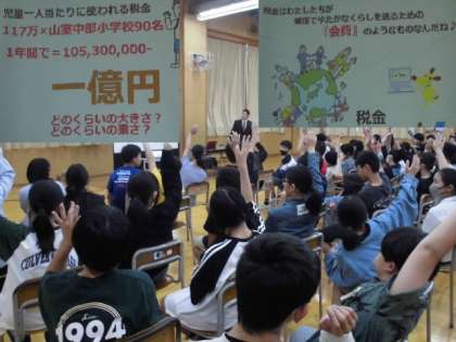 6年生が、富山法人会の職員の方から話を聞く「租税教室」を行いました。「ぼくたち山室中部の6年生で1年間に1億円の税金が使われるんだって」「1億円(と同じ用紙)を持ってみたら重かったよ」消費税など、身近な生活で役立つ税金について学びました。