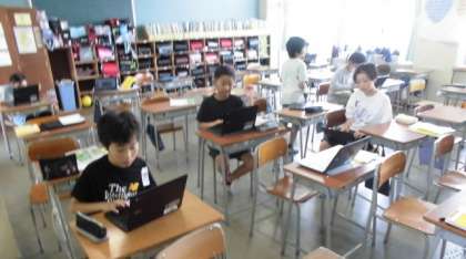 5年2組社会では、北海道と沖縄の、場所や気候、くらしや食べ物等について、インターネットや教科書で調べ、まとめています。「ぼく・わたしは、住むとしたら・・」「富山とちがって・・」など、友達と比べ、相談しながら学習しています。