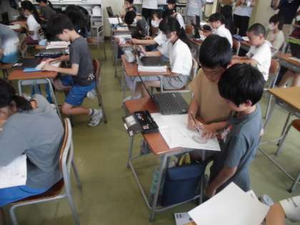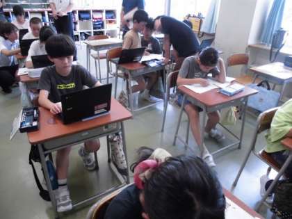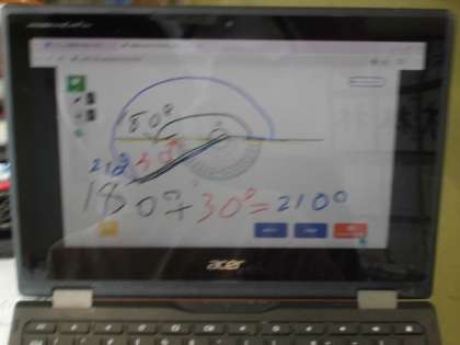 4年1組の算数では「180度をこえる角度のはかり方」を考えました。タブレットのデジタル教科書で動画を見たり、自分で考えた方法をパソコンでまとめて友達と紹介し合ったりしました。