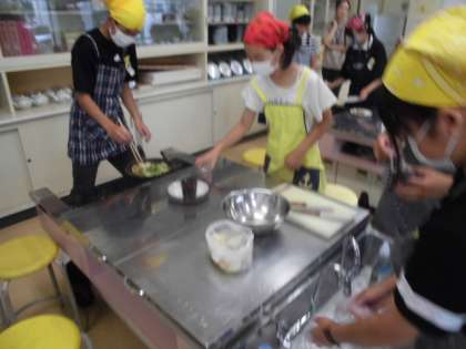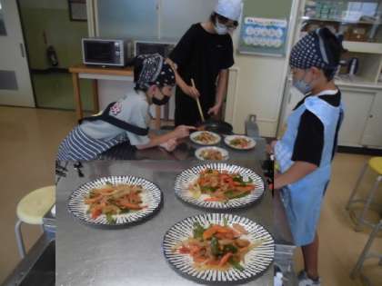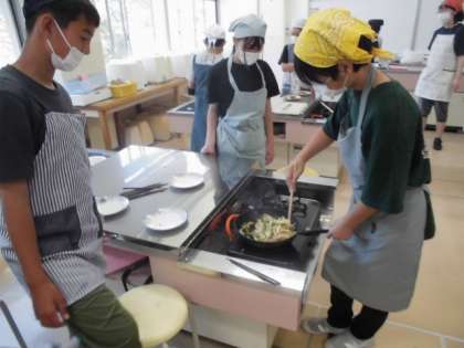 6年3組が家庭科で、野菜いためを作りました。キャベツ、人参、ピーマン、玉ねぎなどをいため、塩こしょうで味付け。協力しておいしくできました。お家でも作るとよいですね。